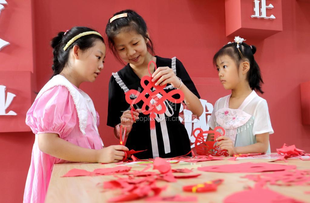 2022年8月11日,在四川省眉山市仁寿县新时代文明实践中心孩子们正在学习剪纸。