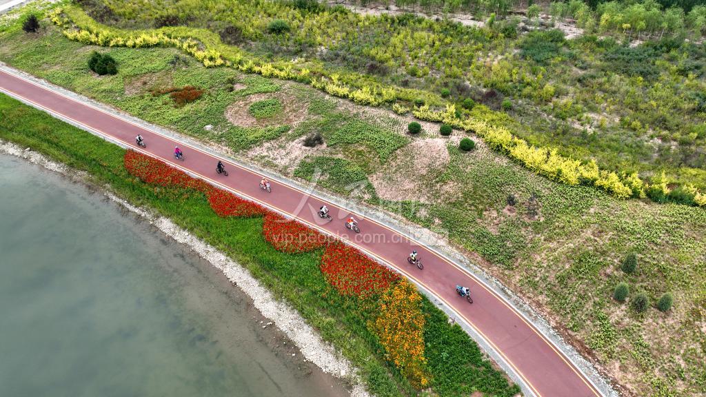2022年8月14日,在甘肃省张掖奥林匹克森林公园,骑行爱好者疾驶在湖畔绿道上运动健身,乐享生态美景。 张掖市甘州区将黑河西岸戈壁荒滩进行综合治理,打造为景色旖旎的奥林匹克森林公园,建设骑行绿道、慢行彩道,配置运动器械,栽植花草树木等,不仅提升了公园品质,也美化了环境,成为众多骑行、健身运动者的网红打卡地。