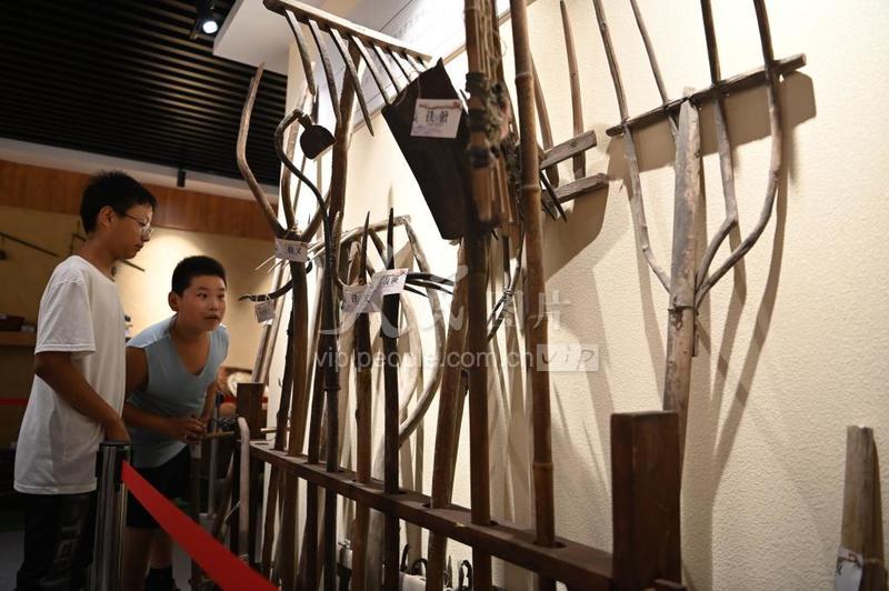 2022年8月16日,在山东省聊城市东昌府区堂邑镇刘庄新村乡村记忆馆,两名小学生在观看传统生产农具。