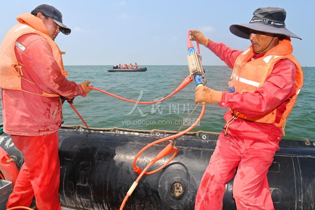 2022年7月26日,汗水伴着海水,采集班员工将一套100多斤重的海缆从海底捞出转到下一束测线布设。