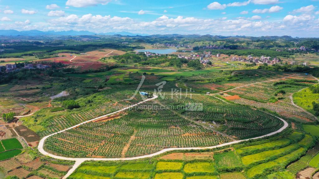 2022年8月18日,湖南省永州市新田县金盆镇徐家村,蓝天白云下,四通八达的道路、整齐成行的沃柑与远处多彩的田园、错落有致的村庄民居相映成趣,构成了一幅产业兴旺的美丽乡村画卷。
