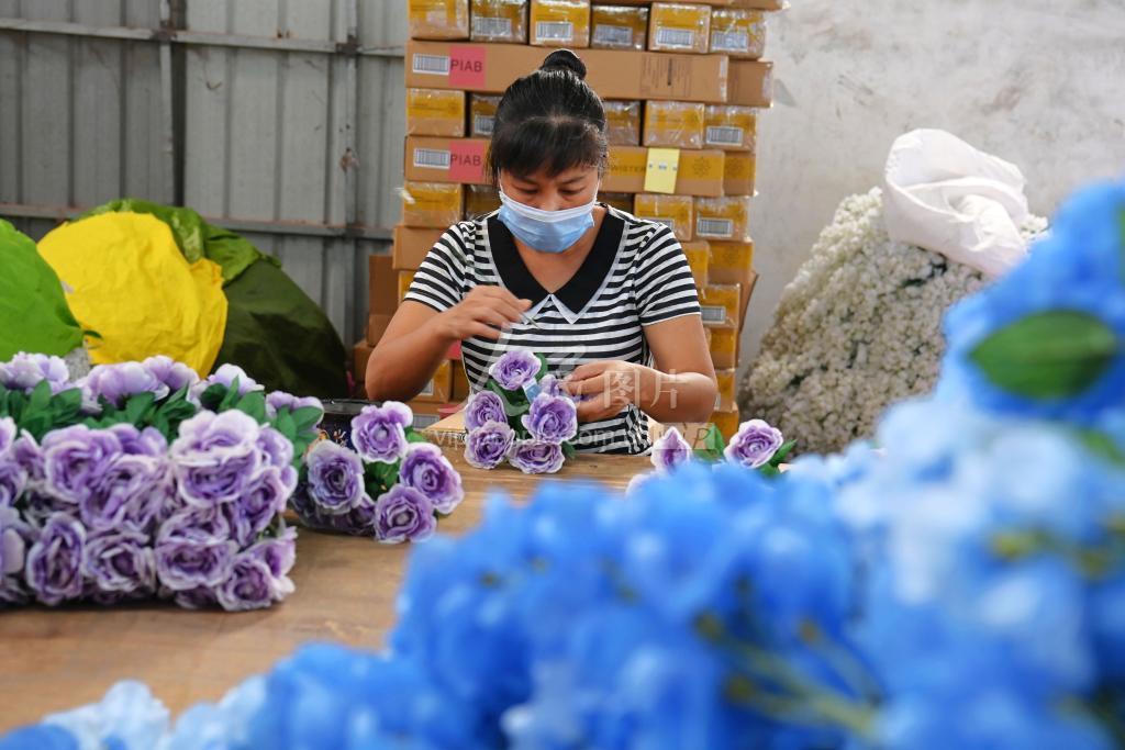 2022年8月22日,在广西北海市合浦县石康镇裕发工艺品厂手工串花加工基地,妇女们在进行手工串花。该工艺品厂主要经营塑料花生产加工,产品是订单式生产,全部出口欧洲。 近年来,合浦县积极拓宽农村群众就业创业渠道,通过定向就业培训,对接用工企业搭建就业平台,采取短期用工、季节用工、临时用工等灵活方式,让农村剩余劳动力在家门口实现就业增收。