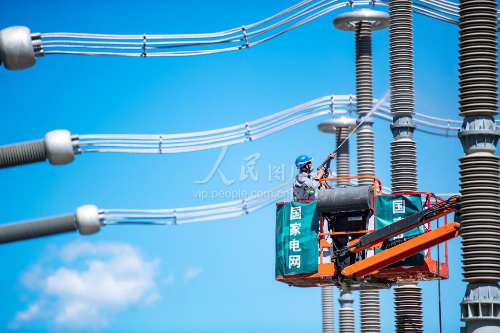 2022年8月25日,北京市延庆区八达岭镇里炮村,安徽送变电工程有限公司检修工人在张北柔性直流电网延庆换流站清洗绝缘立柱。 日前,张北柔性直流电网延庆换流站为期13天的全面体检工作进入尾声,400多名电力检修技术人员正加紧开展检修试验工作,确保北京绿色电能输送主通道的安全稳定运行。