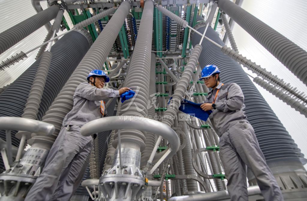 2022年8月25日,北京市延庆区八达岭镇里炮村,安徽送变电工程有限公司检修工人在张北柔性直流电网延庆换流站清洗绝缘立柱。 日前,张北柔性直流电网延庆换流站为期13天的全面体检工作进入尾声,400多名电力检修技术人员正加紧开展检修试验工作,确保北京绿色电能输送主通道的安全稳定运行。