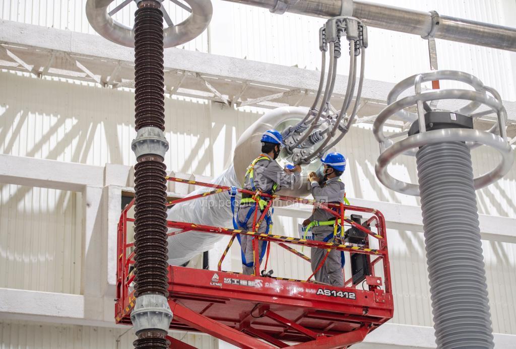 2022年8月25日,北京市延庆区八达岭镇里炮村,安徽送变电工程有限公司检修工人在张北柔性直流电网延庆换流站检查输变电设备。