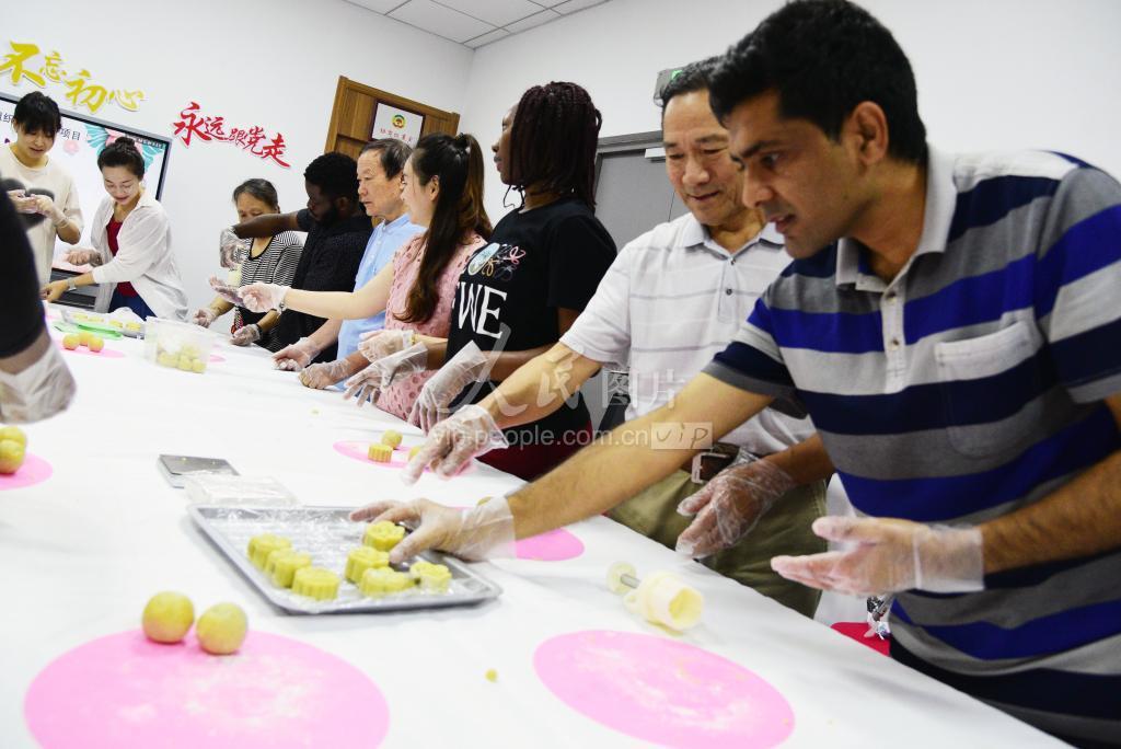 2022年9月8日,在江苏省镇江市润州山路社区,江苏科技大学的外国留学生和居民一起制作月饼。