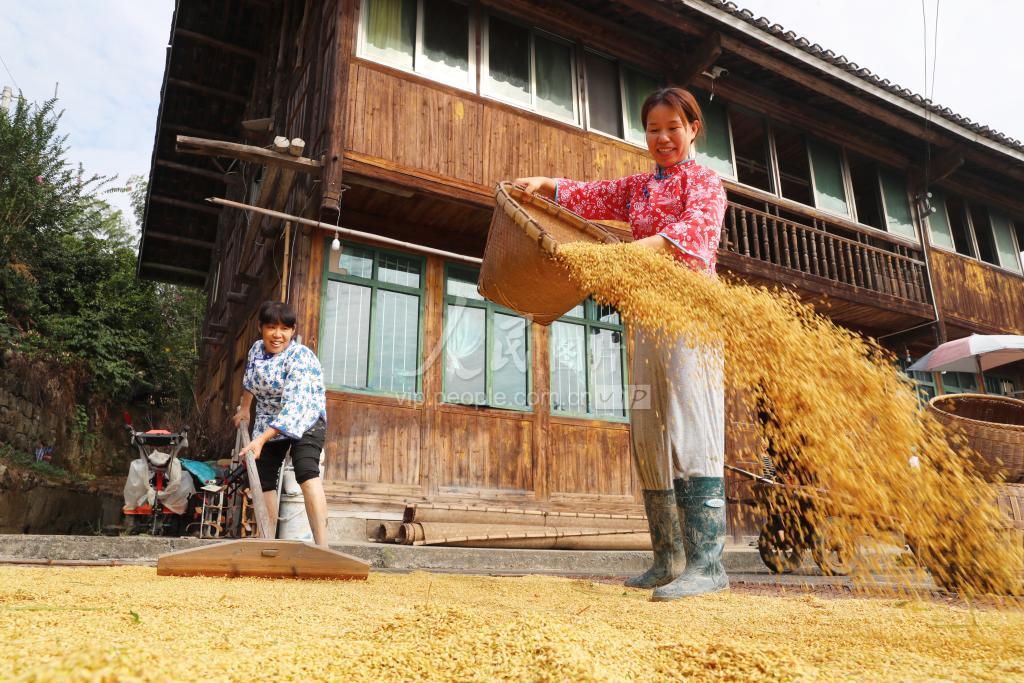 2022年9月8日,湖南省娄底市新化县水车镇紫鹊界村,村民在晾晒稻谷。时下,湖南省新化县紫鹊界梯田水稻成熟开始收割,当地农户纷纷抢抓晴好天气,抢收晾晒稻谷,田间地头到处一派丰收的景象。