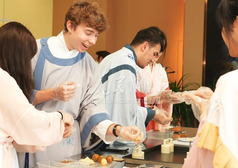 2022年9月9日,广西师范大学中外师生身着中国传统汉服,一起动手制作月饼,感受中国传统节日中秋节的魅力。