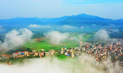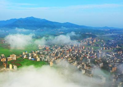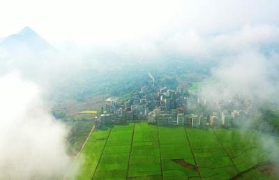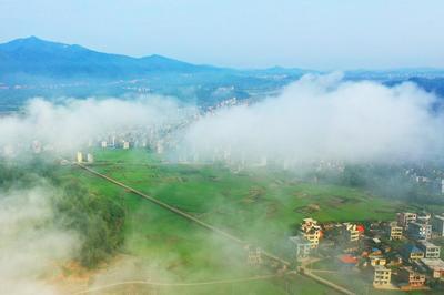 2022年9月10日,湖南省郴州市嘉禾县晋屏镇,乡间上空云蒸雾腾,秀丽村庄、碧绿田园、巍巍青山在云雾中若隐若现,如诗如画,美如仙境。近年来,嘉禾县大力实施乡村振兴战略,加强生态环境建设,发展特色农业产业,使农村面貌焕然一新。