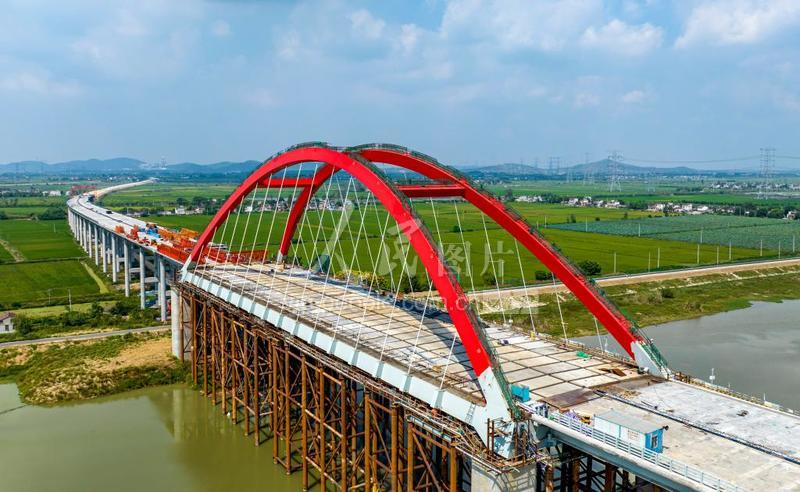 2022年9月17日,安徽省合肥市庐江县盛桥镇境内的无岳高速兆河特大桥施工现场,建设者们正坚守岗位确保施工进度。 无(为)岳(西)高速兆河特大桥是沪武高速安徽省无为市至岳西县段(也称无岳高速)工程的重要节点工程。大桥全长2402米,主桥跨径135米,主桥采用提篮式钢箱系杆拱结构,拱肋最高点距离水面达60米。