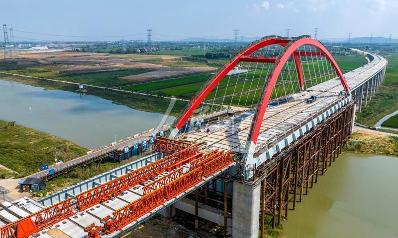 2022年9月17日,安徽省合肥市庐江县盛桥镇境内的无岳高速兆河特大桥施工现场,建设者们正坚守岗位确保施工进度。 无(为)岳(西)高速兆河特大桥是沪武高速安徽省无为市至岳西县段(也称无岳高速)工程的重要节点工程。大桥全长2402米,主桥跨径135米,主桥采用提篮式钢箱系杆拱结构,拱肋最高点距离水面达60米。