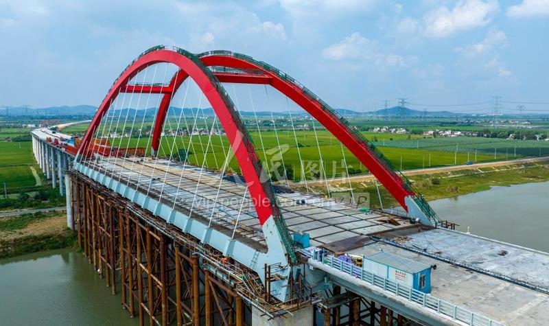 2022年9月17日,安徽省合肥市庐江县盛桥镇境内的无岳高速兆河特大桥施工现场,建设者们正坚守岗位确保施工进度。 无(为)岳(西)高速兆河特大桥是沪武高速安徽省无为市至岳西县段(也称无岳高速)工程的重要节点工程。大桥全长2402米,主桥跨径135米,主桥采用提篮式钢箱系杆拱结构,拱肋最高点距离水面达60米。