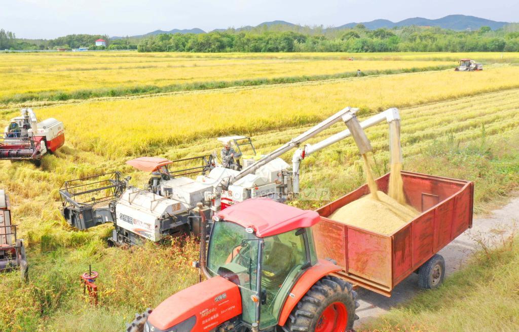 2022年9月23日,在安徽省滁州市南谯区施集镇河东村,农民正驾驶农业机械收割水稻,确保颗粒归仓。金秋时节,安徽省滁州市南谯区种植的35万亩优质杂交水稻全面进入收割期,当地农民利用晴好天气的有利时机,采用机械化作业加快收割进度,确保粮食颗粒归仓。