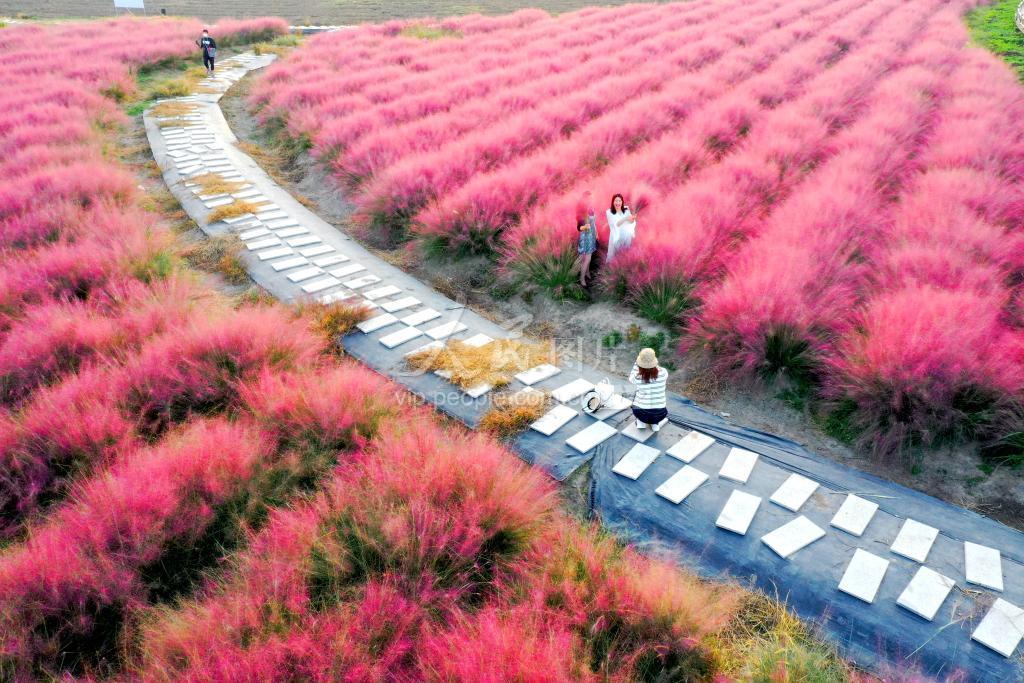 9月23日,位于江苏省宿迁市沭阳县耿圩镇淮西村的中闽花海内,乱色迷离的粉黛子草吸引当地许多居民群众前来观赏。