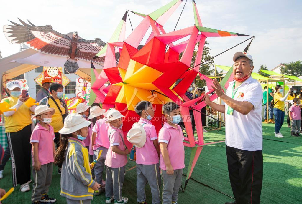 2022年9月23日,小朋友在2022年江苏“中国农民丰收节”主会场丰收大集上非遗展区参观艺人制作的风筝。