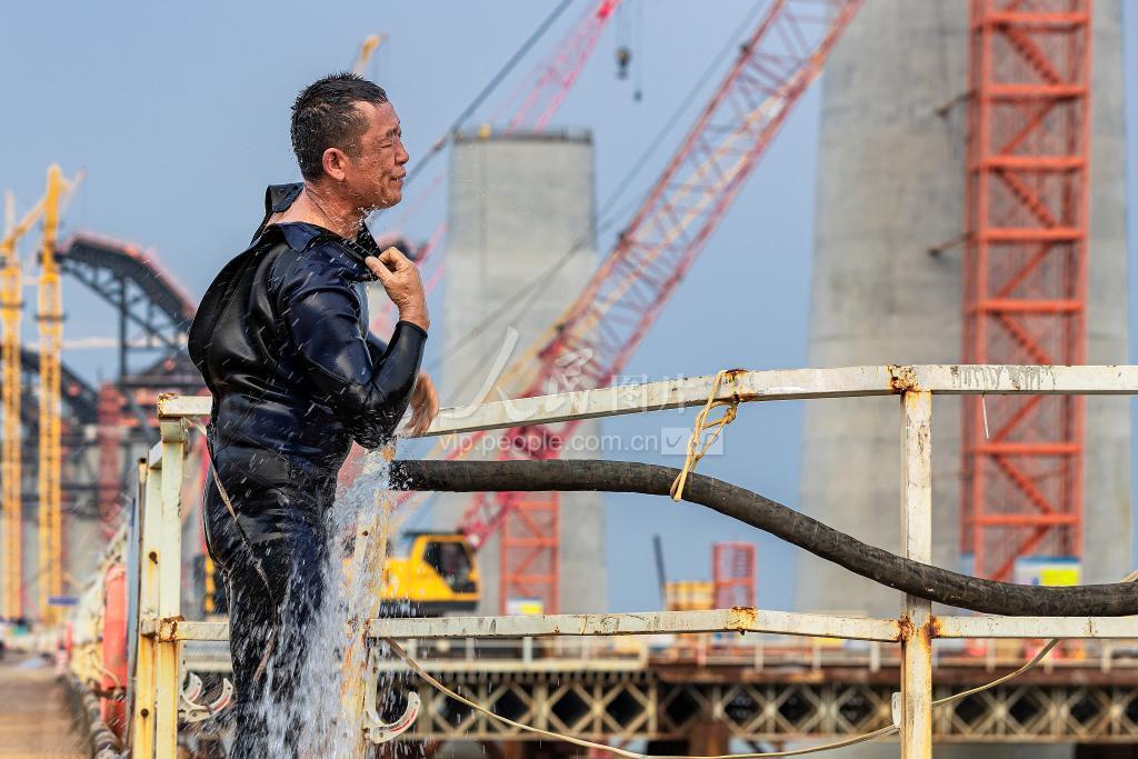 2022年9月24日,位于广东省珠海市高栏港经济区的黄茅海跨海通道建设如火如荼,图为图为在水底完成切割作业的蛙人在现场冲洗淤泥。