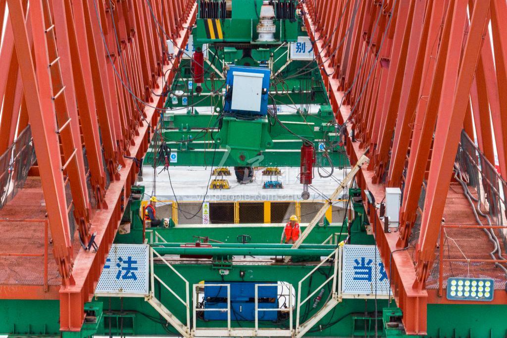 2022年9月24日,位于广东省珠海市高栏港经济区的黄茅海跨海通道建设如火如荼,图为工人在珠海侧开展大型箱梁铺装作业。