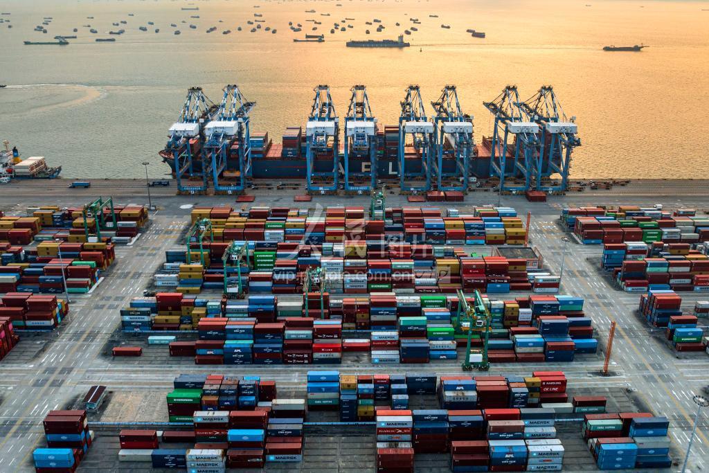 2022年9月27日,在位于广东省广州市南沙区龙穴岛的广州港南沙港码头一派繁忙,珠江口伶仃洋水面上各类船舶往来穿梭,在朝阳下映衬下成为了“黄金水道”。