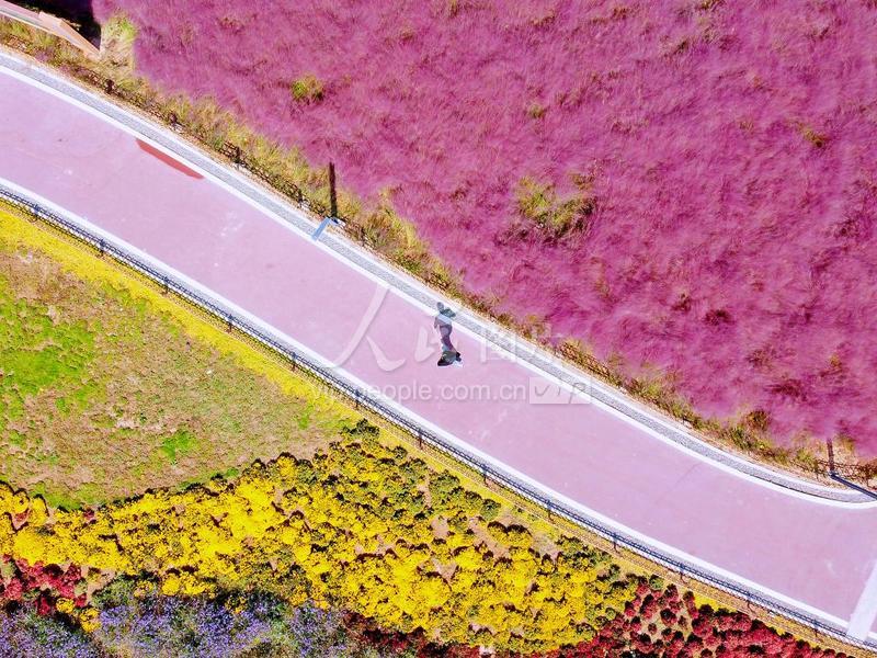 2022年9月28日,河南省三门峡市虢都花海公园的粉黛乱子草进入盛开期,呈现出一片粉色海洋,为城市增添一道靓丽的风景。