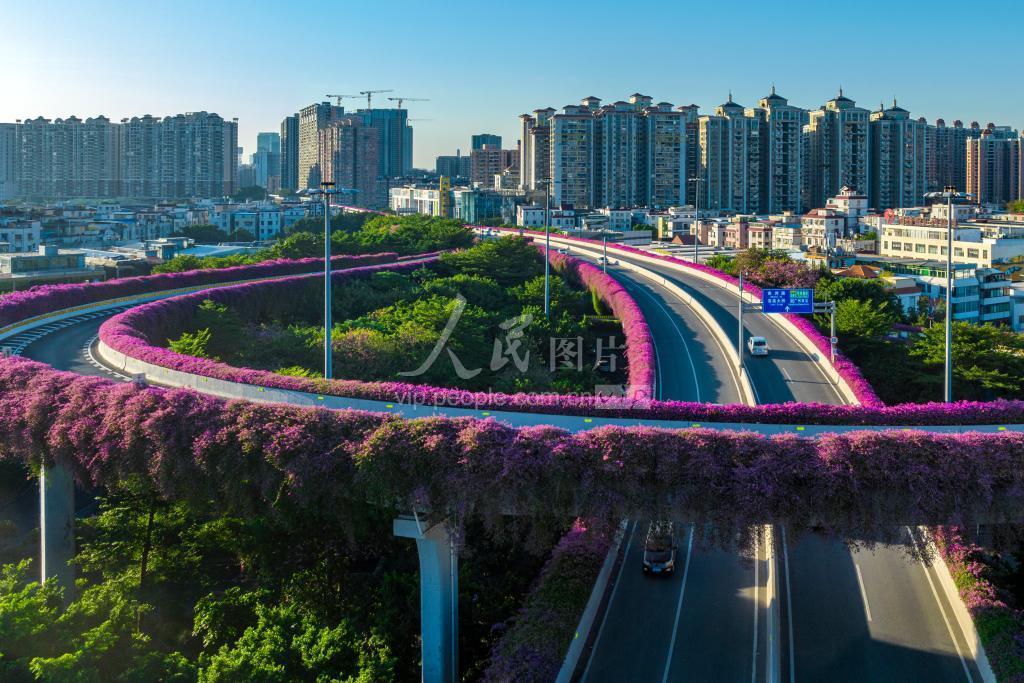 2022年10月13日,广州海珠区东晓南路立交桥两侧绵延的簕杜鹃姹紫嫣红,汽车穿梭在层层叠叠的簕杜鹃花海中。