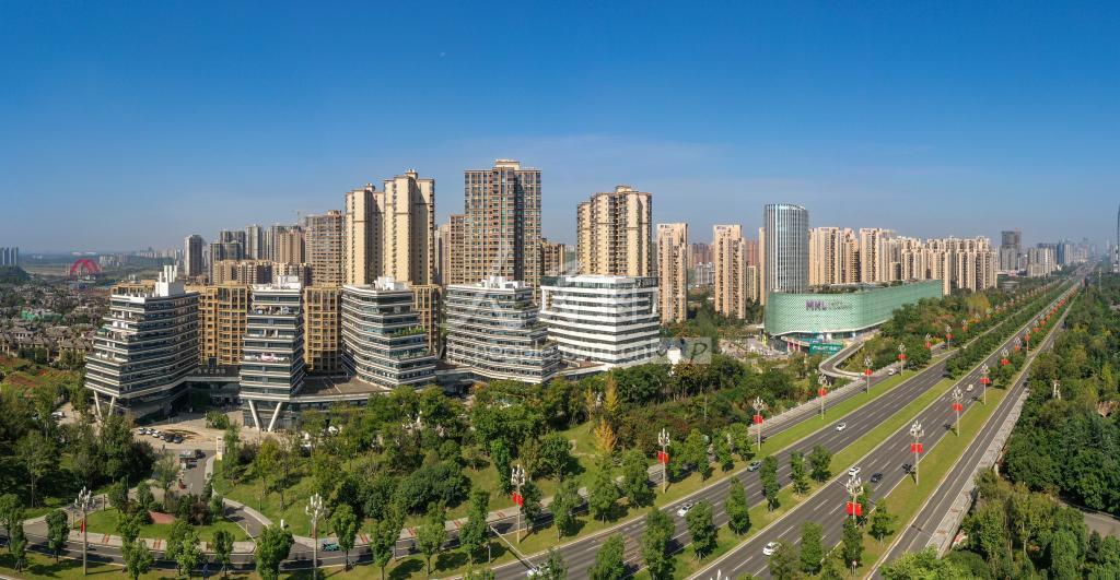 2022年10月16日,云淡风轻,阳光明媚,四川省成都市天府新区,楼宇、森林与天府大道相映成趣,构成一幅和谐美丽的画卷。