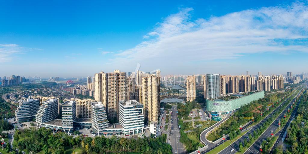 2022年10月16日,阳光明媚,四川省成都市天府新区,楼宇、森林与天府大道相映成趣,构成一幅和谐美丽的画卷。