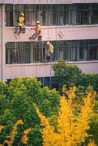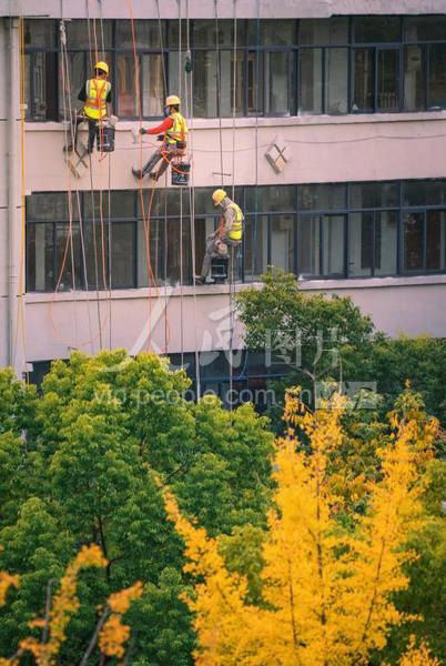 2022年10月21日,工作人员正在安徽马鞍山花山区矿山新村楼房外粉刷墙面。