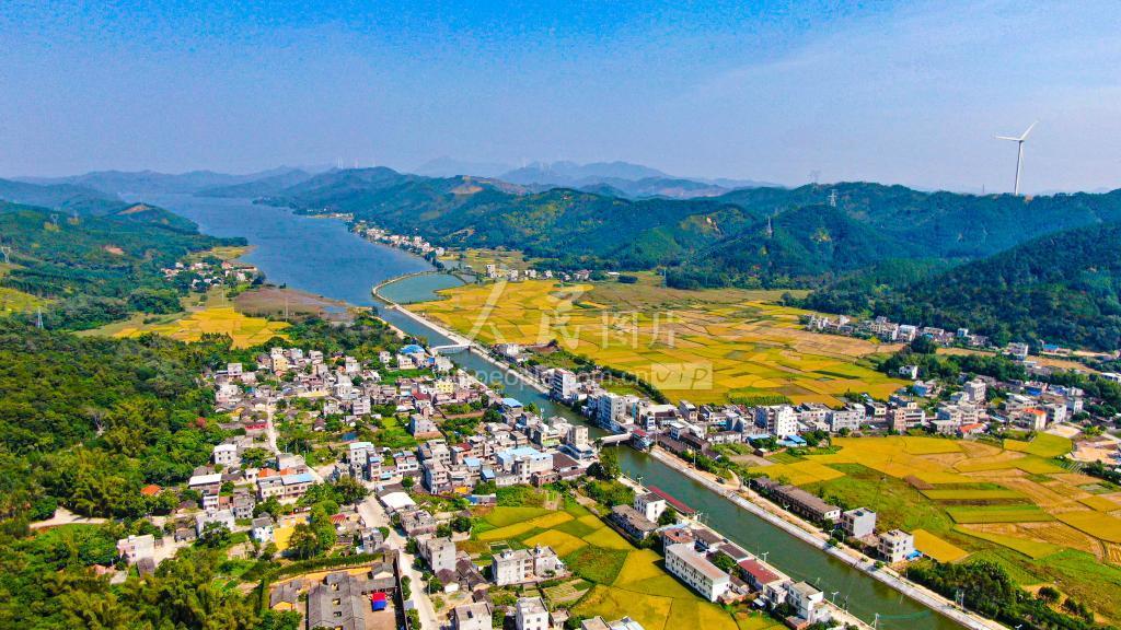 2022年10月29日,广西北海市合浦县曲樟乡的晚稻进入成熟收割期。大片金黄色的稻田在阳光的映照下显得格外亮丽,稻田宛如披上一层黄金衣,与错落有致的村落、河流、公路、风车交相辉映,构成一幅美丽的田园“丰”景画。