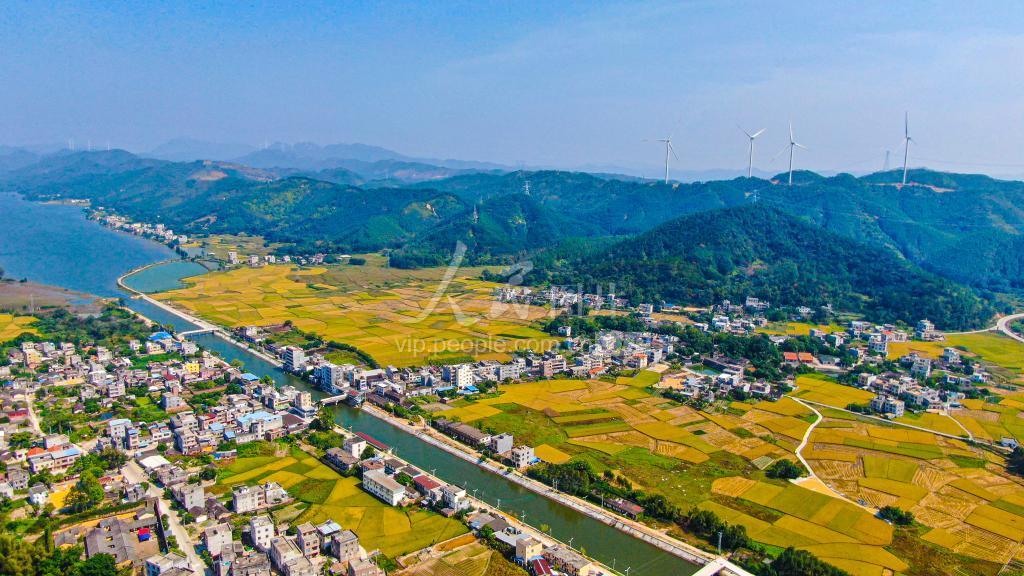 2022年10月29日,广西北海市合浦县曲樟乡的晚稻进入成熟收割期。大片金黄色的稻田在阳光的映照下显得格外亮丽,稻田宛如披上一层黄金衣,与错落有致的村落、河流、公路、风车交相辉映,构成一幅美丽的田园“丰”景画。
