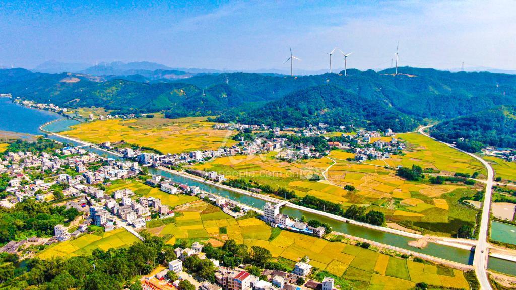 2022年10月29日,广西北海市合浦县曲樟乡的晚稻进入成熟收割期。大片金黄色的稻田在阳光的映照下显得格外亮丽,稻田宛如披上一层黄金衣,与错落有致的村落、河流、公路、风车交相辉映,构成一幅美丽的田园“丰”景画。