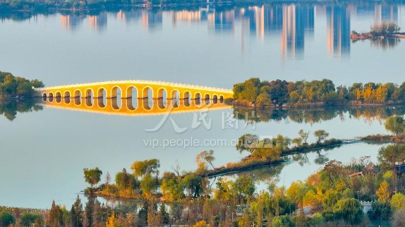 金秋时节,安徽省淮北市国家湿地公园南湖风景区层林尽染,美不胜收,秋色怡人,吸引众多游客前来游玩赏秋。