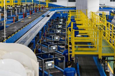 2022年11月9日,安徽省合肥市肥东县龙塘工业园一快递企业内,工人们在全自动化分拣机前忙碌。该快递分部近期因“双十一”日受理快递逾100万件,全自动分拣机大大提高了工作效率,保障快递尽快到达消费者手中。