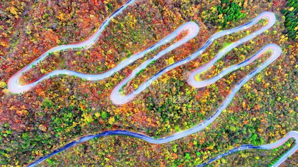 2022年11月24日,湖北省十堰市房县野人谷镇境内“十回首”公路犹如一条巨龙盘山而上,公路沿线层林尽染,美轮美奂。