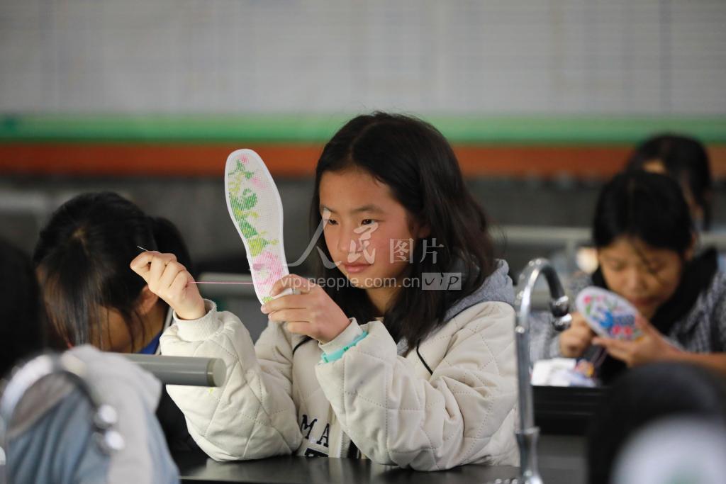 2022年11月24日,贵州省从江县刚边壮族乡中学的学生在课后学习绣鞋垫。
