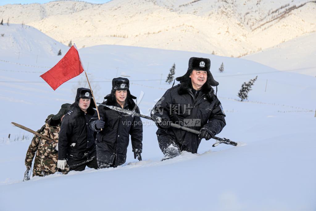 2022年11月24日,新疆阿勒泰边境管理支队库卫边境派出所民警和护边员冒雪翻山对大雪过后的边境辖区开展巡逻,实地查看积雪对边境前沿基础建设设施和辖区居民住房、道路的影响,确保边境区域群众的生产生活正常有序。