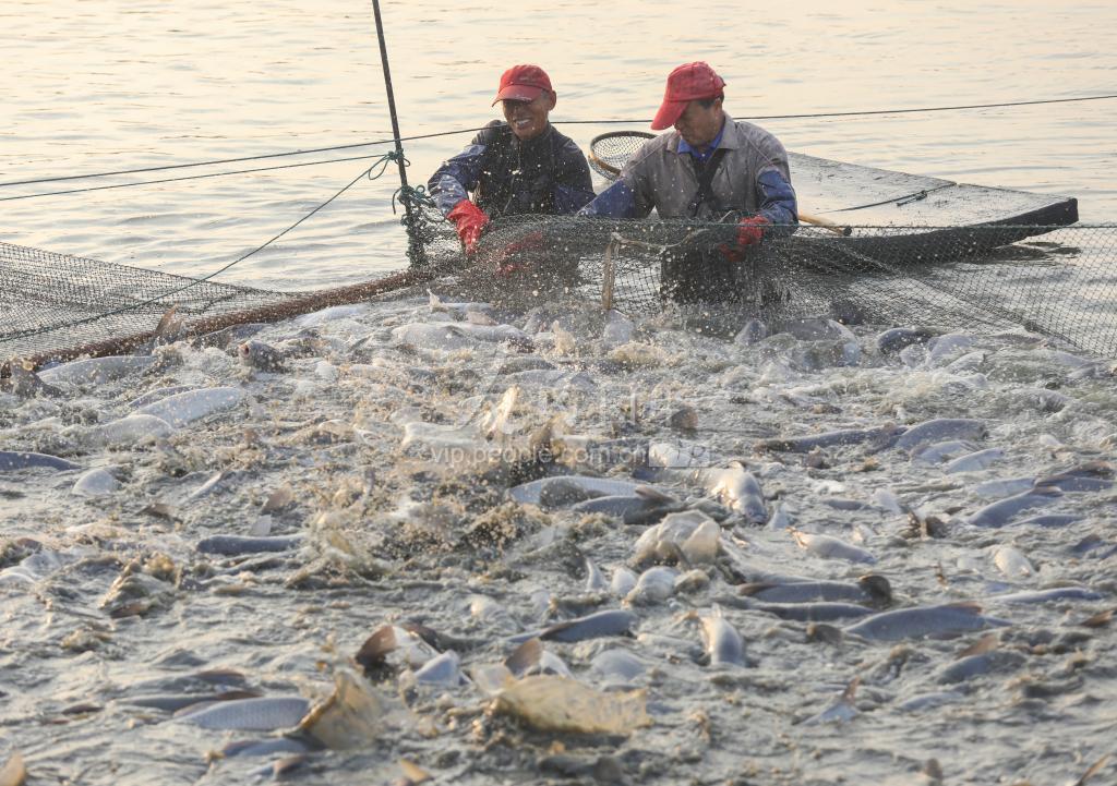 2022年11月25日,浙江省湖州市长兴县夹浦镇陶家湾村,村民养殖的草鱼、青鱼、鲢鱼喜丰收,捕鱼现场一派繁忙景象。 近年来,浙江省湖州市长兴县夹浦镇陶家湾村充分利用丰富的水面资源,大力发展特色水产养殖,让有经验的专业人员带动低收入农户一起养殖草鱼、青鱼、鲢鱼等水产,不仅壮大了村级集体经济,同时让更多村民富起来。