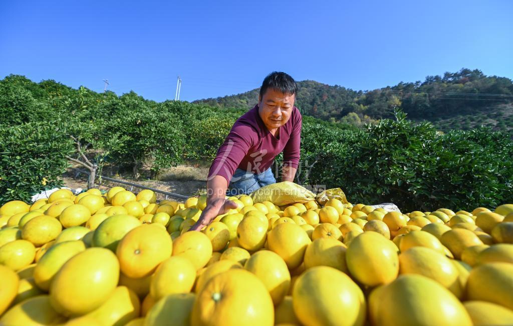 2022年11月24日,浙江省杭州市淳安县千岛湖西南湖区茅头尖林场,桔农们忙着整理采摘的椪柑。