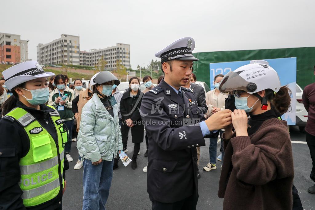 2022年11月24日,江西省上栗县公安局交警大队民警在辖区企业开展交通安全知识宣传时,讲解头盔的佩戴方法。