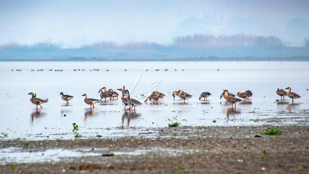 2022年11月25日,江苏南京市溧水区石臼湖湿地,成群的鸿雁在湿地觅食栖息。