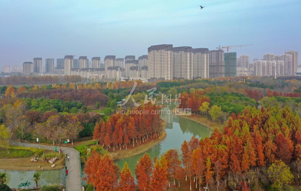 2022年11月25日,在江苏省宿迁市泗洪县城东生态体育公园,蜿蜒的河道,如S湾,如游龙,河清岸秀。河畔水杉、柳树色彩绚丽,层林尽染。公园周边现代居民小区,鳞次栉比,一幅生态公园、美丽宜居的画卷。
