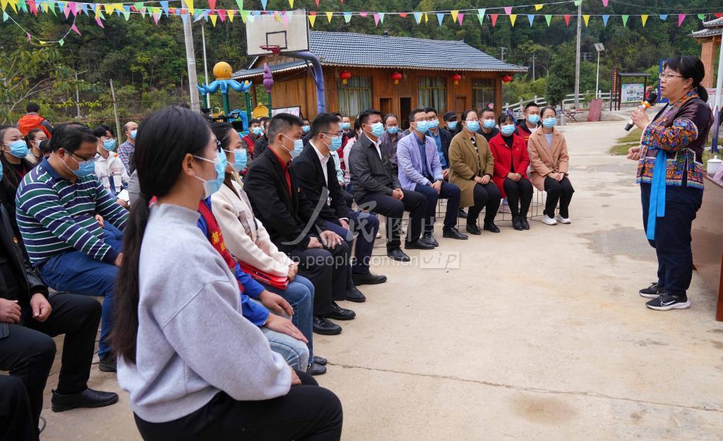 11月25日,在广西融水苗族自治县安陲乡江门苗寨,党的二十大代表、该县安陲乡江门苗寨党总支书记杨宁(穿苗衣者)为党员干部群众宣讲党的二十大精神。