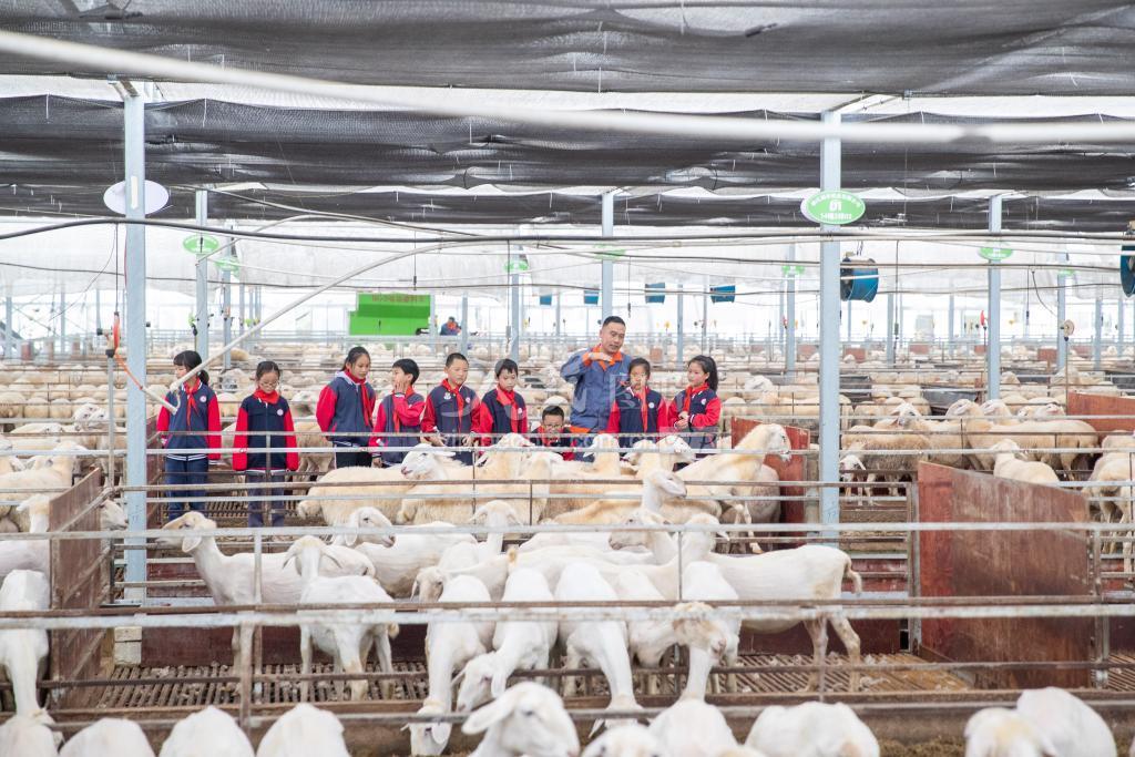 2022年11月25日,浙江省湖州市长兴县吕山乡共享牧场内,牧场技术人员正在为学生讲湖羊的习性。 长兴县吕山乡“共富课堂”开课了。当天,吕山乡中心小学组织学生们来到吕山乡共享牧场,通过与参观羊舍、小羊互动等环节,体验湖羊养殖过程,感受家乡湖羊文化。