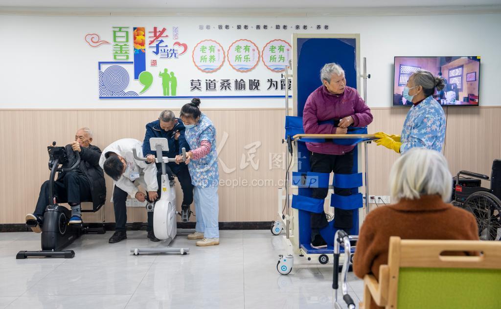 2022年11月30日,江西省吉安市吉水县双村镇医养服务中心,工作人员正在带领老人做康复训练。