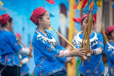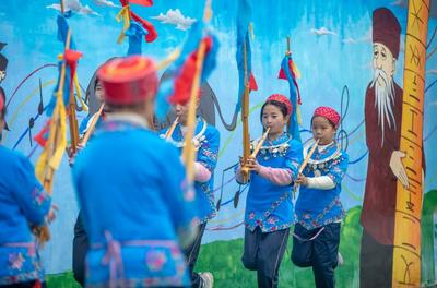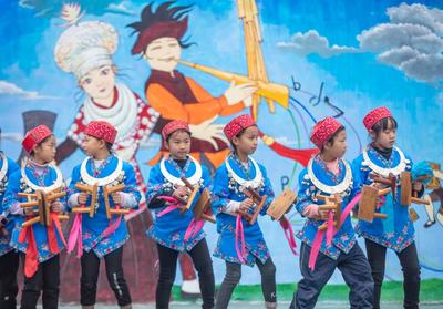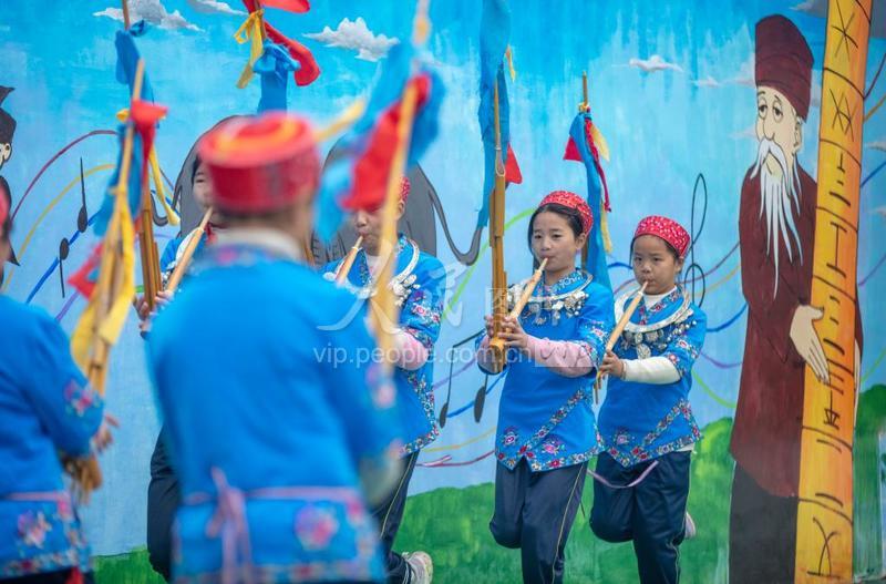 2022年12月8日,贵州省黔东南苗族侗族自治州施秉县杨柳塘镇中心小学学生在冬季校运会上展演苗族芦笙舞。