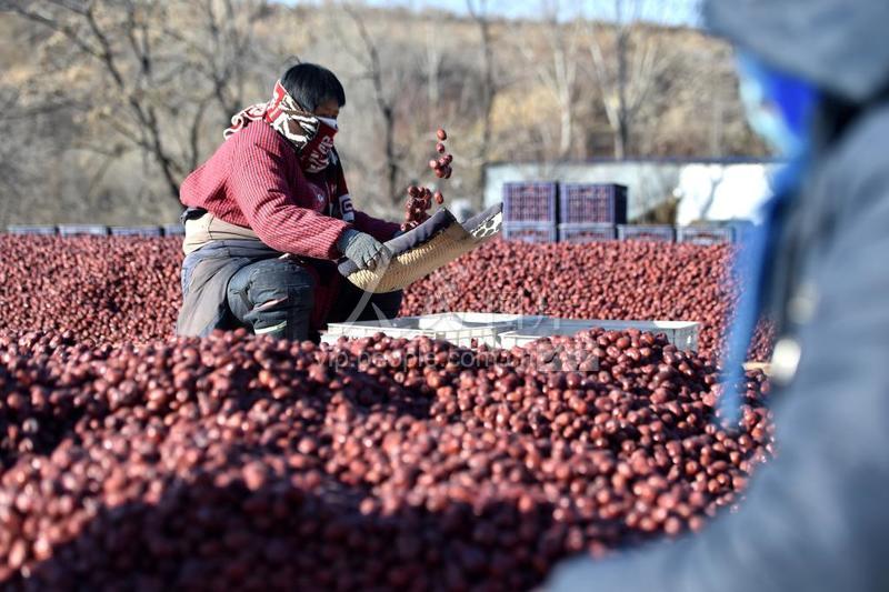 2022年12月13日,河北省石家庄市行唐县九口子乡西玉女村农民分拣大枣。