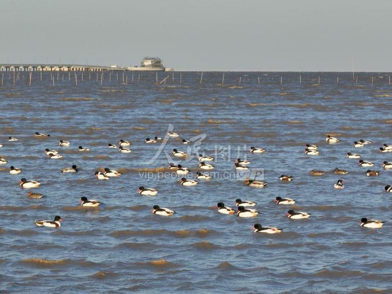 2022年12月22日,在江苏省连云港市海州湾北部赣榆新城区沿海拍摄的翘鼻麻鸭。 近日,在江苏省连云港市海州湾北部赣榆区沿海,成群憨态可掬的翘鼻麻鸭,在海水中欢快地游来游去,时而潜入水中或飞到浅海滩涂觅食,与不远处的赣榆城区、过往渔船相互映衬,构成一幅唯美的山水画卷。
