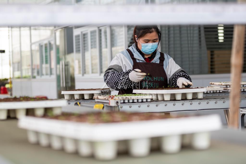 2023年1月4日,在位于广东省广州市花都区的广州绿沃川高新农业基地的智能温室蔬菜大棚,工人正在生产线进行菜苗培育作业。