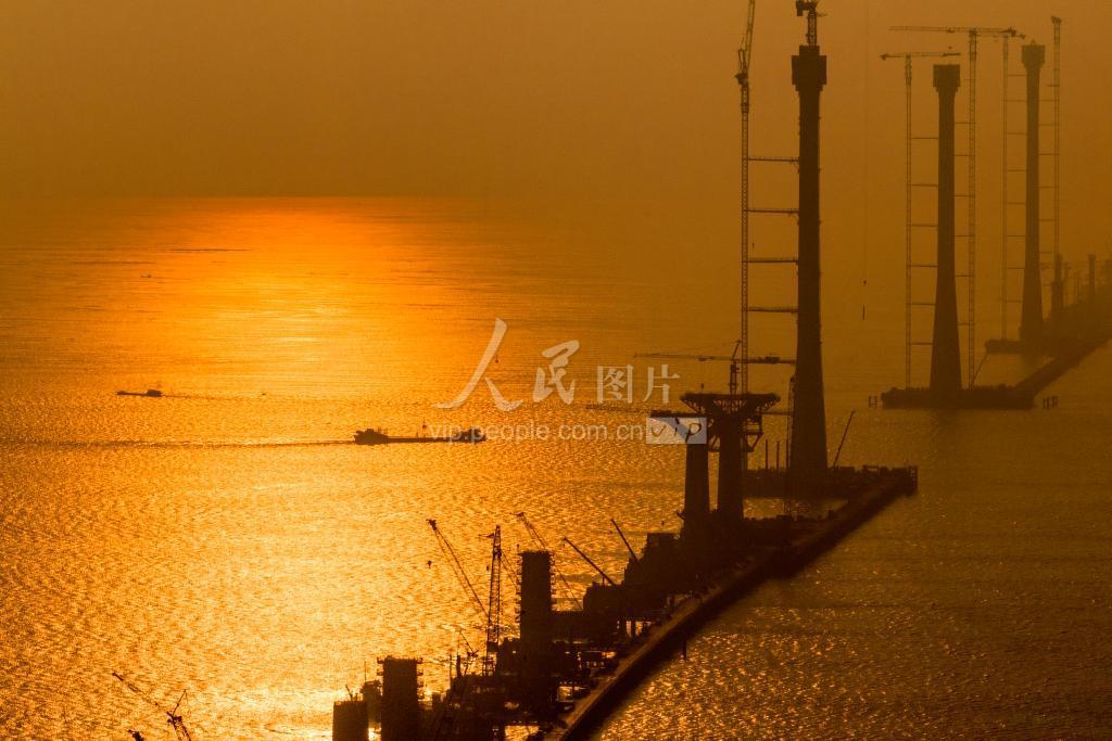 2023年1月5日,在位于广东省珠海市高栏港经济区的黄茅海跨海通道建设现场,夕阳的掩映下的3座在建的主塔,一艘轮船即将穿过。
