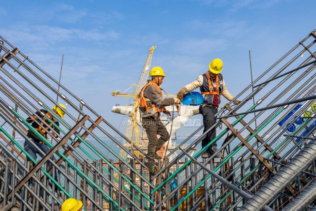 2023年1月5日,在位于广东省珠海市高栏港经济区的黄茅海跨海通道建设现场,建设者在桥墩进行钢构作业。