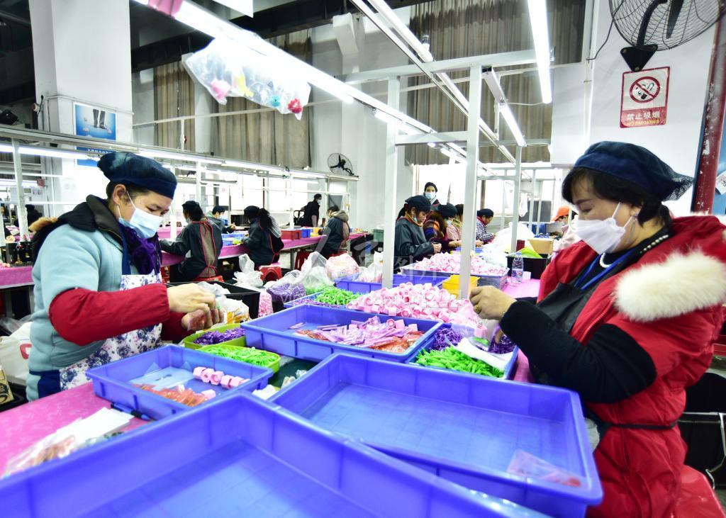2023年1月6日,湖南省郴州市嘉禾县经开区一外贸企业,工人们忙着加工生产出口玩具。